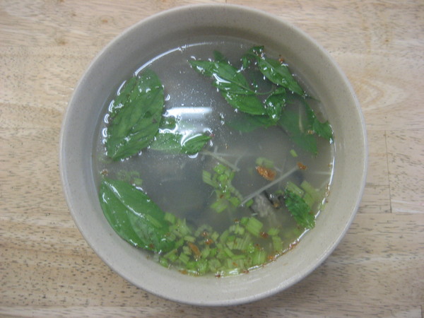 蚵仔湯先上菜,上面浮著芹菜末及幾片九層塔。