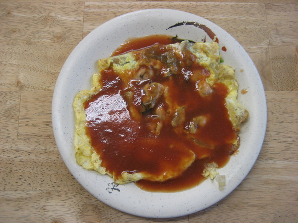 蚵仔煎進得口來,但覺不油不膩,鬆軟清爽,醬汁也配合得恰到好處。怪不得內人每次來此,必點此菜。可她不喜吃蚵仔,總把蚵仔挑給我吃。最近最為暴笑的廣告台詞「味噌湯加貢丸,蚵仔煎加蛋不加蚵仔」的作者,說不定也娶了個這樣的太太。