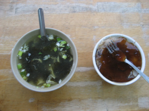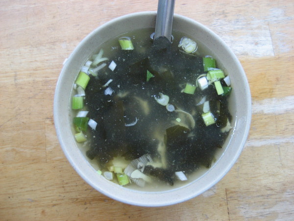 紫菜湯極為簡單,就是海帶芽、蔥花與少許的蛋花。老闆謙稱,他們用的是普通的海帶芽。吃了幾次,我卻覺得料多實在,海帶芽入口也很滑潤清爽。