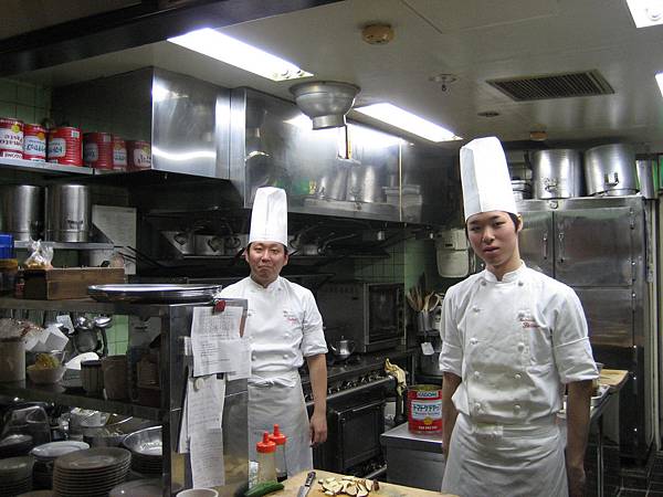 這個小餐廳位於地下室,佔地不大。難得的是廚房採開放式,有大飯店水準。兩位小廚師看來俊俏而敬業: