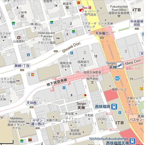 從下榻飯店旁的天神西通,往北跨越昭和通,走到對面;同樣一條街,街名由天神西通變更為親富孝通。在親富孝通的第二個路口右轉直走,途經安國寺,走到盡頭,即碰到福岡最重要的南北幹道──渡邊通。在此左轉,第一棟大樓就是Hiwaka大樓: