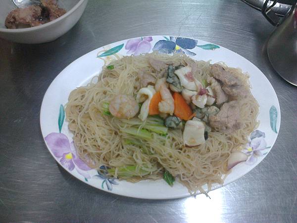 炒米粉內容豐富,除基本的豬肉片、高麗菜、青蔥之外,海鮮類的蝦仁、花枝、蚵仔都有。與新鮮屋一樣,主要是米粉裡加了醋,味道很鮮美。