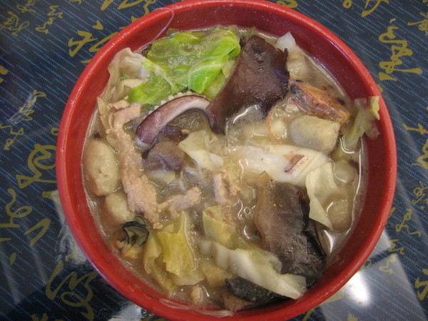 各位可見「麗珠」同時烹煮那麼多碗麵與米粉,我的配料卻一樣不少,包括兩尾蝦、花枝、蚵仔、豬肝、木耳、小貢丸以及豬肉絲、高麗菜與青蔥等等。