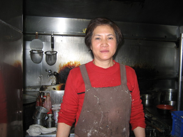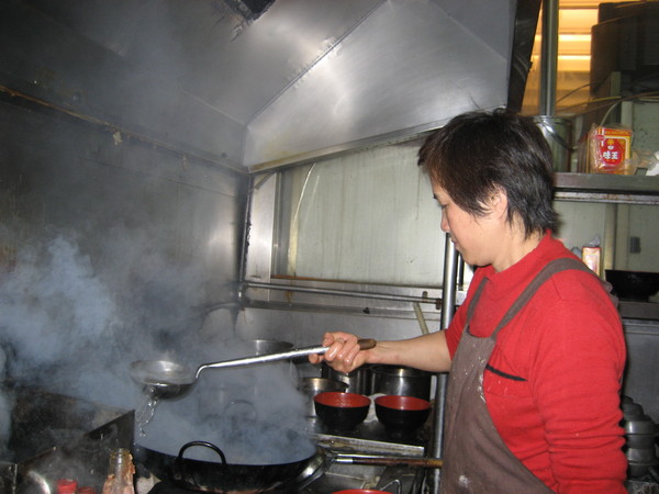 腳踏綠色塑膠地毯上,往裡走,途中可見本店的女廚師正用心地烹煮著。
