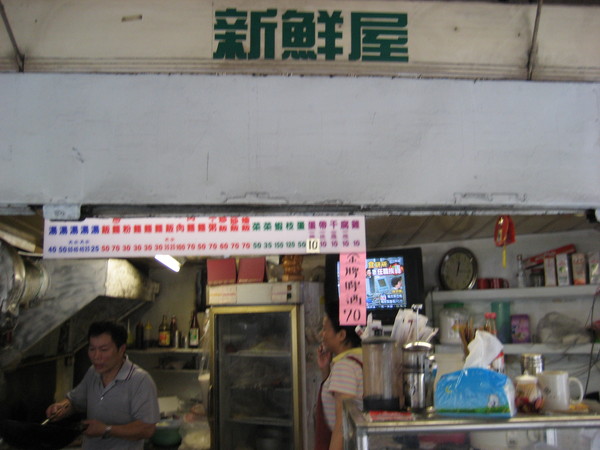 老闆兼廚師的大名用紅色的大字寫在店面一側。店的名字,新鮮屋,只用綠色小字寫在店面正上頭: